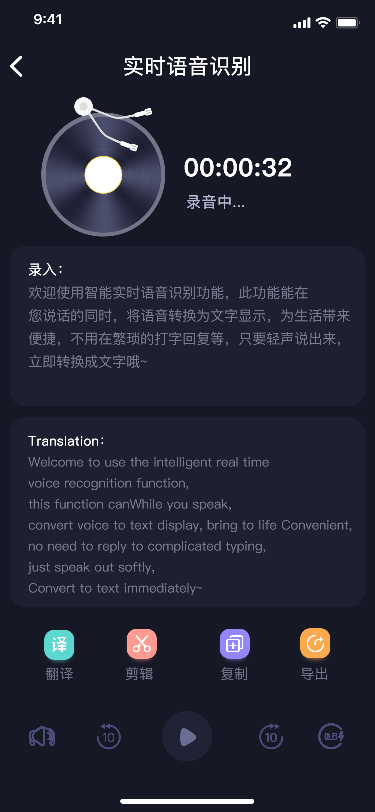 支持录音实时转写、音频转文字、实时语音翻译等功能,高效精准的音